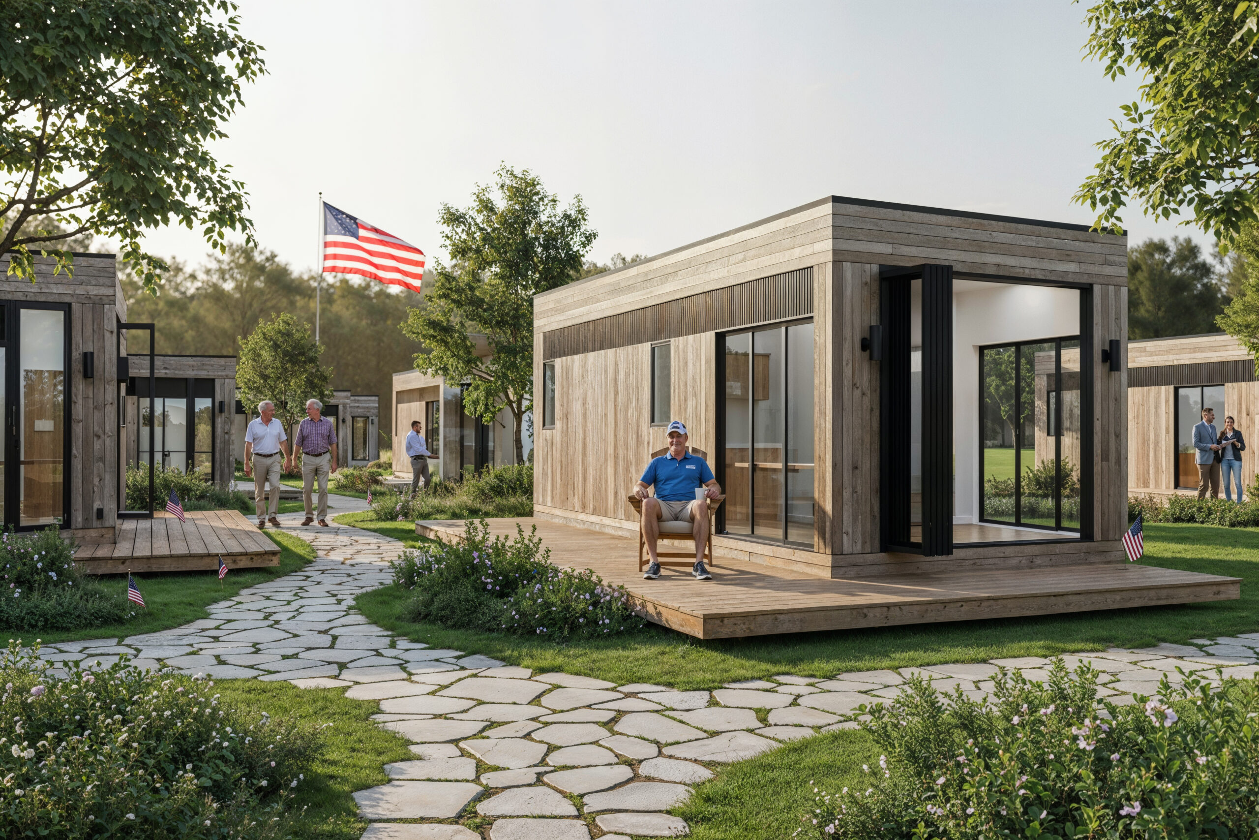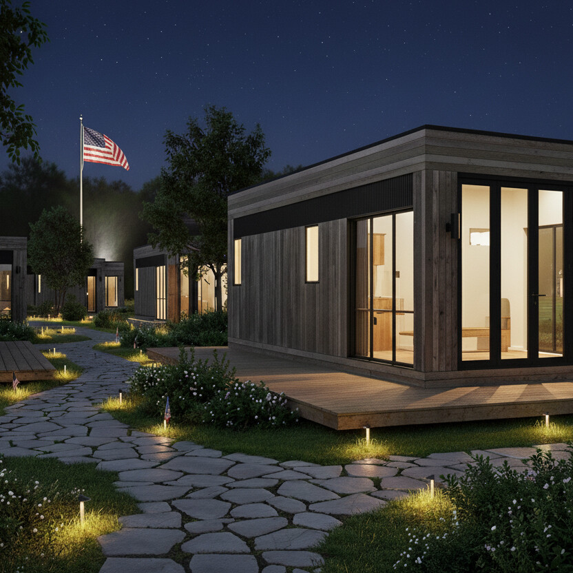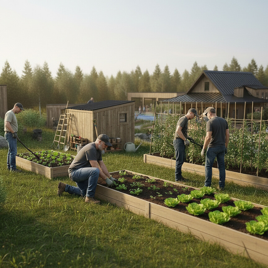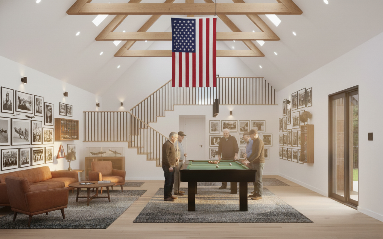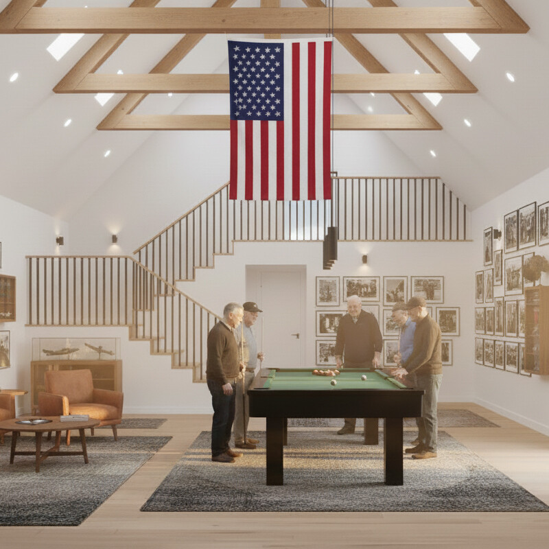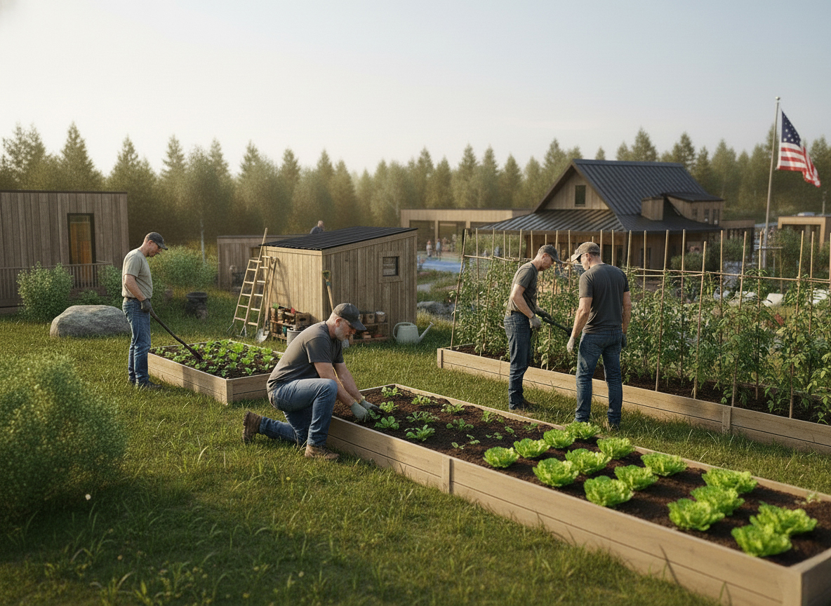 The Brave Living community is more than just housing; it’s a holistic approach to support, offering amenities like a central garden for growing food, which not only provides nourishment but also therapeutic benefits through gardening. The American flag flying high symbolizes our respect and commitment to those who have served our country.