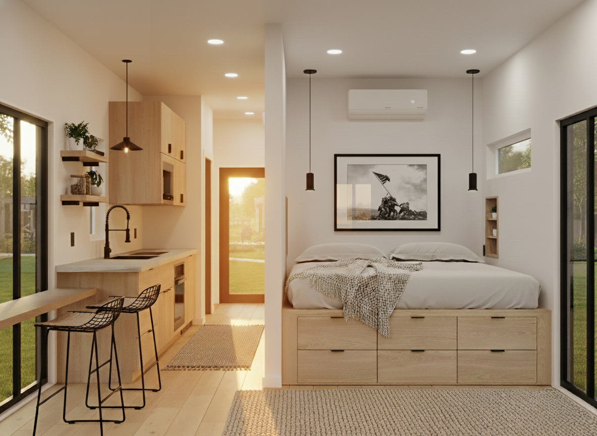 The concept of Brave revolves around small, efficient living spaces that are self-sustaining. Each unit features sleek exteriors with expansive glass walls that allow natural light to flood the interiors, creating a warm, inviting atmosphere. The design integrates flat roofs and solar panels, promoting sustainability and reducing the environmental footprint.